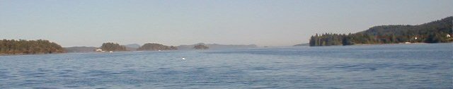 I awoke with a start. Something was very wrong. Wind or no wind, I wanted out of this place. It was giving me goose bumps. I had no clock but I judged it to be past midnight. The sea boiled around me as I launched. I crossed a bay and heard something that made my blood run cold. There were sucking noises as waves arose out of nowhere and lifted and crashed. Never before had I experienced such a grim sound. My blood ran cold. I paddled with all my strength through boiling cauldrons of water as I struggled with whirl pools, the winds roaring around me. In my minds eye I imagined what it would be like sitting by the fire reading about this epic, wishing very much I was in that armchair. It crossed my mind I might die. If swamped, I thought in all probability I would be able to swim to shore, once the kayak sank. I imagined knocking on one of the doors of the houses, a sorry sodden mess, spending years of my life paying back the lost equipment. Somehow, carrying on like this, and muttering implications to heavenly hosts, I made it to Long Harbour.  I would not go down it, I decided. Too long. I was tired. It was late. I would save time and go across the mouth of the harbour in search of a beach on the far side. All of the ferries were berthed by now.  A third of the way across I noticed lights on a boat far off in the distance. As I stared these lights began to loom. It was a ship. Oh oh. Could this really be a BC Ferry? All of the ferries were not berthed. Oh no. I could hear the thump of engines. It was coming rapidly. It was bearing down on me faster than I could paddle.
